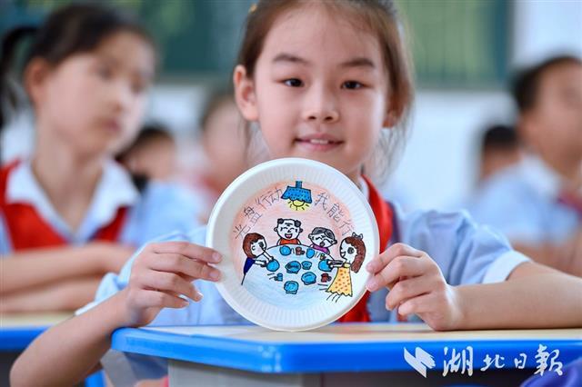 学生展示手工制作的“爱惜粮食”主题“光盘”